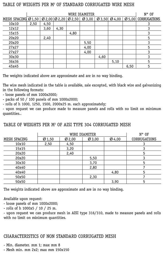 Corrugated mesh is produced by twisting together drawn wires that have been corrugated beforehand, by being passed through two gears that allow for perfect corrugation. In some cases it is possible to create mesh with the same light spacing but with different corrugation.